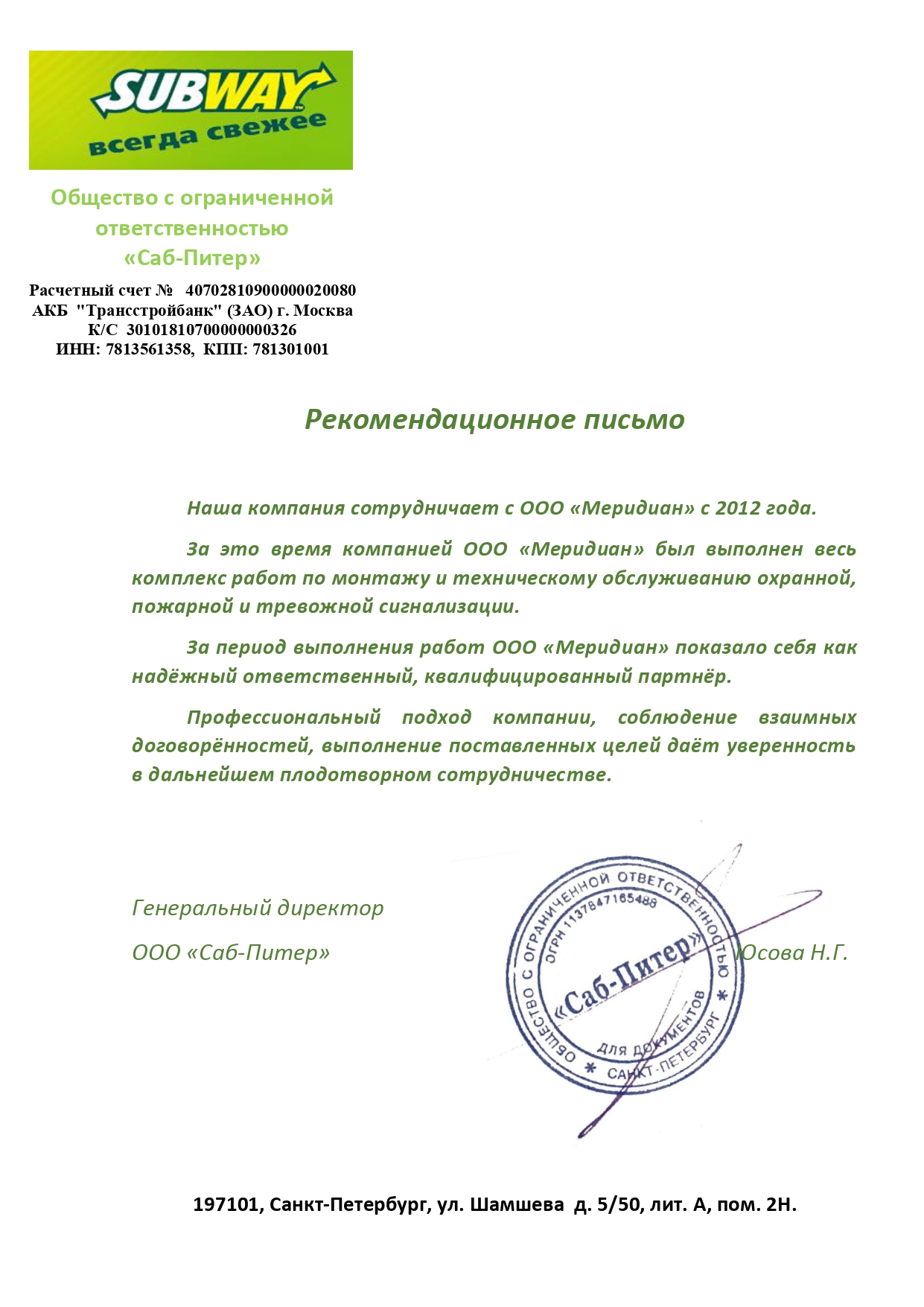 В сети ресторанов быстрого питания “SubWay” произвели комплекс работ по проектированию и монтажу систем охранной, пожарной и тревожной сигнализации, а также систем оповещения и управления эвакуацией при пожаре. В ресторанах сети также осуществили монтаж акустической системы для равномерного распределения звука по площади ресторанов. Отзыв