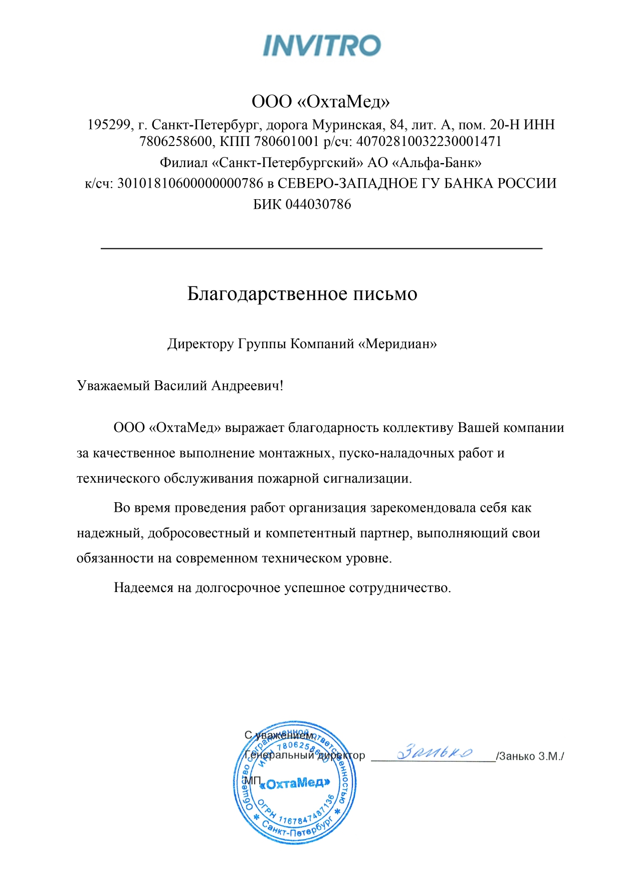 Для лабораторной сети «Инвитро» наши специалисты осуществили выполнение монтажных и пуско-наладочных работ пожарной сигнализации, оповещения и управления эвакуацией при пожаре.Отзыв
